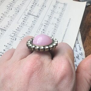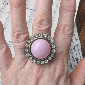 This striking ring showcases a large pastel pink cabochon stone, elegantly framed by a circle of silvery beads. The bold design and contrasting colors make it a standout piece, perfect for making a statement.
