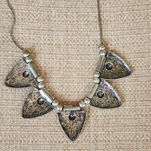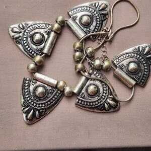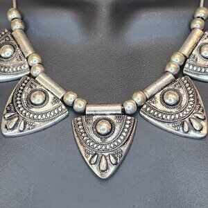 Featuring five large antique silver-tone triangular pendants with intricate embossed detailing, this necklace is perfect for adding a bold ethnic flair to your outfit.