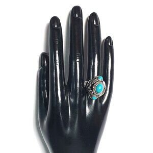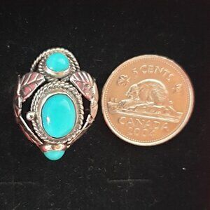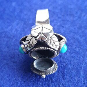 The ring’s design showcases three vibrant turquoise cabochons framed in bold sterling silver with twisted rope detailing and leaf motifs—hallmarks of early Taxco silver artistry. Its substantial size and unique poison box feature make it not just a piece of jewelry, but a conversation starter.