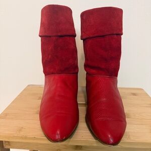 red leather boots, suede cuff, vintage footwear, 80s fashion, retro boots, pointed toe, stacked heel, bold color, mid-calf height, statement shoes