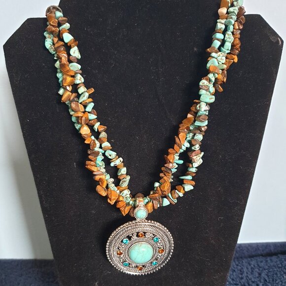 Make a bold statement with this stunning handcrafted set featuring genuine Tiger Eye and Turquoise nuggets. The intricate multi-strand necklace is designed with natural stone chips, blending warm earthy tones with cool turquoise hues for a timeless boho-chic look.