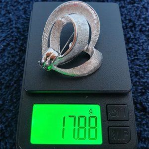 This vintage silver-tone brooch features a bold swirling bow design, embodying mid-century sophistication. The piece showcases a textured finish, adding depth and contrast to its gracefully looping structure. Its substantial weight and sturdy craftsmanship suggest quality construction, making it a durable and timeless accessory. It is perfect for adding a touch of vintage charm to coats, blazers, scarves, or hats.