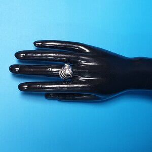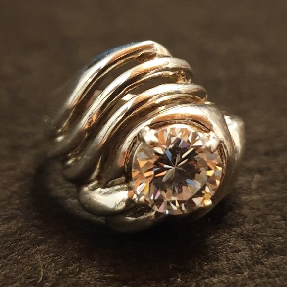 Make a striking impression with this unique vintage sterling silver statement ring! It features a brilliantly faceted 8mm cubic zirconia set in an elegant tension-style / bypass-inspired setting. Its sculptural, flowing design wraps gracefully around the stone, creating a bold, modern aesthetic while maintaining timeless vintage charm.