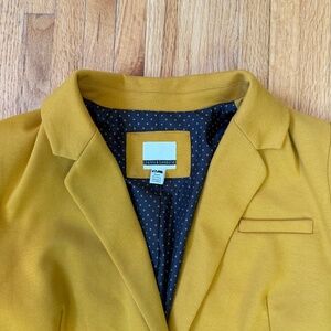 mustard blazer, tailored fit, notch lapel, single button, structured, navy lining, polka dot detail, soft suiting, hip-length, pre-loved