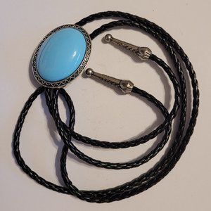 This Bolo tie has an leather type material cord that is 38 inches long..