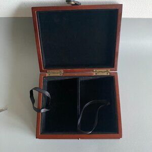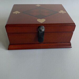 Bombay 2001 Wood Play Card Storage Box. Hinged lid, Velvet lining, leather strap with snap closure on front. Very superficial light signs of wear as pictured.