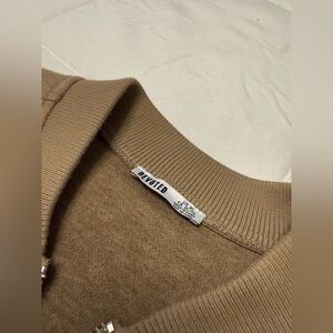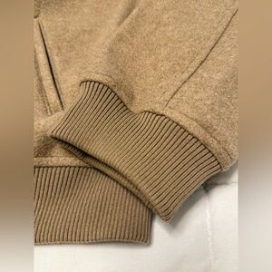 Beige bomber jacket with a soft wool-like feel.