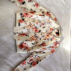 Off white bomber jacket with pink flowers smooth material with a soft and comfortable border, very light weight.