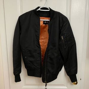 Black bomber jacket with orange inside, never worn (with tags). Bigger then true size