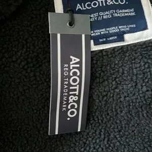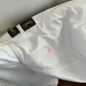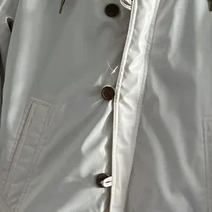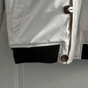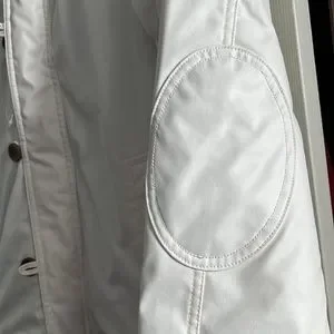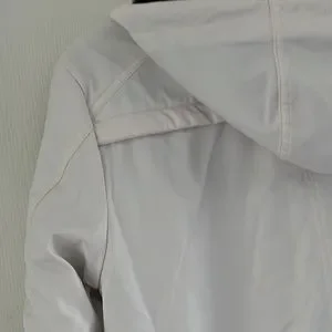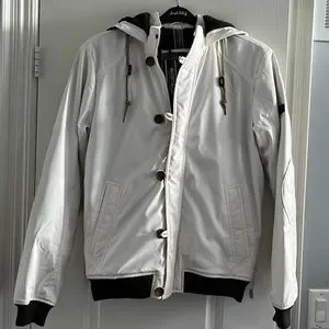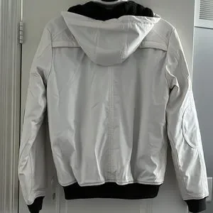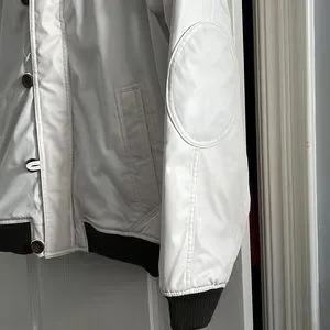 White Bomber jacket. fake leather. There is a red stain on the hood. Brand new. Size large
