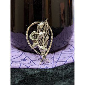 Bond Boyd Sterling Silver Brooch Pin Rose with Leaves, Feather in Rope Loop