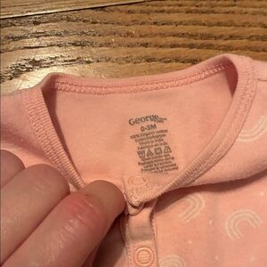 Charming floral navy pajamas with pink accents. 2 pink sleepers. 2 leggings and one shirt. The onesie pink sleeper says NB, but it fits more like a 0-3 month.