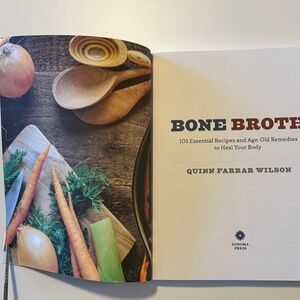 Rustic farmhouse cook book with traditional broth + soup recipes.