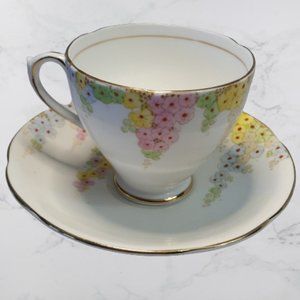 This delicate tea cup and saucer set have a springtime feel as the cascading flowers are in pastel tones of spring green, light blue, yellow and pink with accents of taupe and gold trim on cup and saucer edge and inside band and handle of cup. No chips, cracks or repairs. This item is in good vintage condition - some light wear is to be expected.
