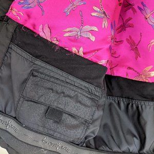 Bonfire Astro women's down insulated snowboard jacket. Black with silky dragonfly print hot pink interior. Feminine cut puffy jacket. 15K/10K waterproof/breathability rating. 550g down fill - super warm. Mesh-lined pit-zip vents. Zippered pockets. Media pocket and hidden pocket inside. Snow skirt. Size M. In good used condition, only worn a handful of times. Mostly some wear to the pink inner liner and the hand gaiters.
