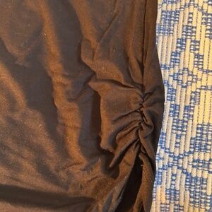 Drapey black cap sleeve T shirt with ruching at the hem by Edista Los Angeles. Silver tone Eiffel Tower on front. Fabulous under a black blazer!