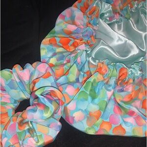 Floral bonnet with light blue satin lining comes with matching floral scrunchie