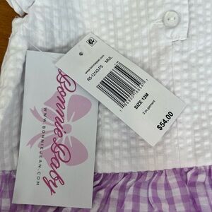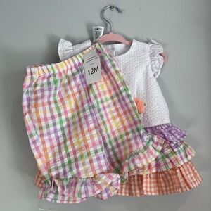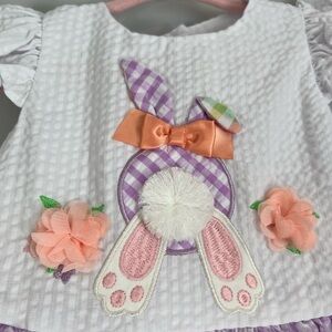 The cutest matching set by Bonnie Baby. Pink, yellow, green, orange, purple pastel colours throughout on a base white. The cutest bunny appliqué on the front with a 3D bow, folded ear, flowers, and pom pom tail. Tiered ruffle-type layers. Set includes top and bottoms. Top is more the length of a dress. Perfect for spring, summer, Easter, church. Nice, light material.