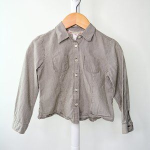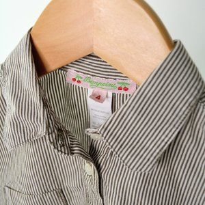 Lightweight, thin brown and white stripes with a button front. 100% cotton.