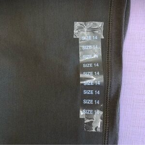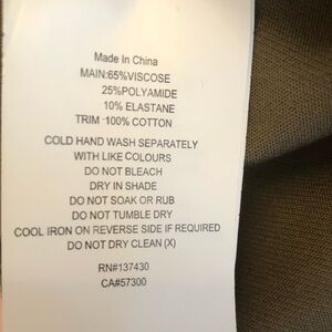 The store tag is cut off but the plastic size market still stuck on legs. Colour is Khaki Green with brown undertones. (some photos look tan…but that’s not accurate)
