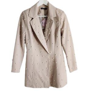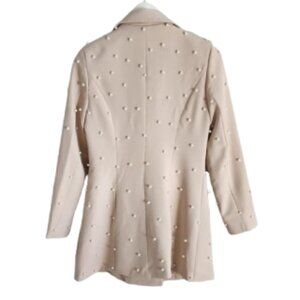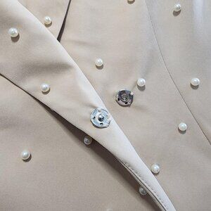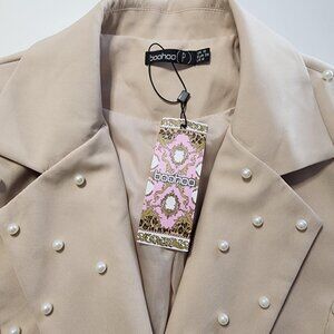 Boohoo blush beige nude faux pearl detail blazer dress in women's size US 6 petite - the size label indicates P for petite (the faux pearl placement and lapels are different on the regular and plus size versions of this blazer dress)