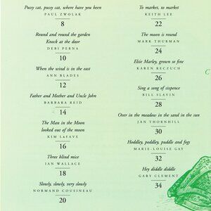 This book 'features art donated by 29 of Canada's best-loved illustrators. Simon Ng's cover illustration does not depict the usual great white bird--instead, it is a stylized, buxom, but authentic Canada goose. The verses, chosen by the artists, offer a pleasing mixture of new and familiar rhymes. The illustrations, though of many different styles, are arranged so that they provide a sense of balance and unity.' -- School Library Journal