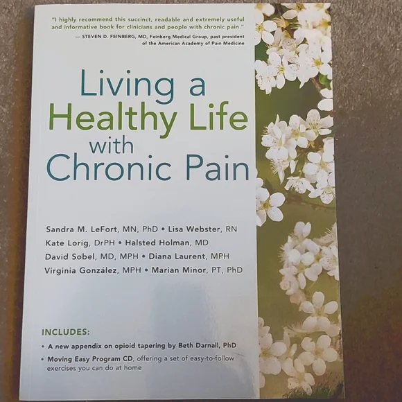 Large paperback non fiction book, Living A Healthy Life with Chronic Pain. Includes an appendix on opioid tapering and a Moving Easy Program CD, with easy to follow exercises you can do at home.