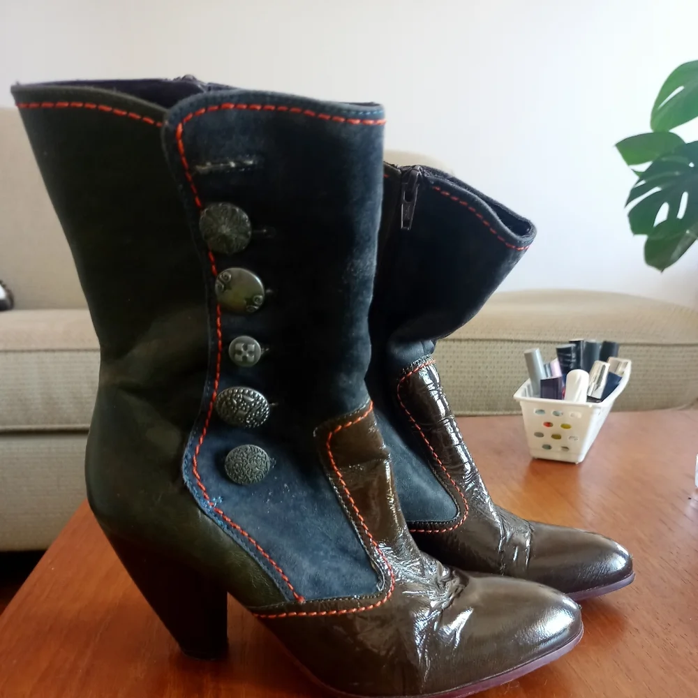 True Religion brand booties. Barely worn. Green, blue and brown. Button detail on the side. Center stitch detail on the heal. Size 7.5.