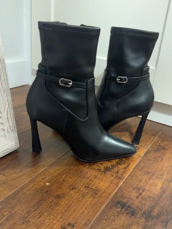 Ankle booties with 3.5 heel height and buckle accent. Small scuff on toe shown in image, can be fixed.