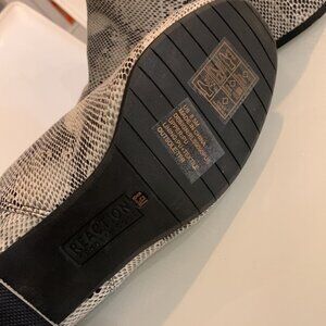 New - no box. Kenneth Cole Reaction booties. Faux snake skin - side zip 2” block heel boots. Zippers on inside and outside.