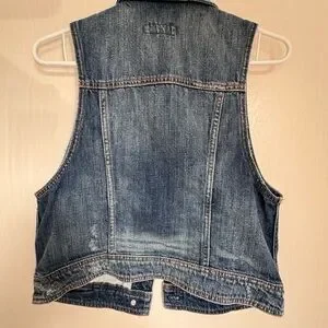 Distressed denim vest by Bootlegger. Features button details and a stylish look.