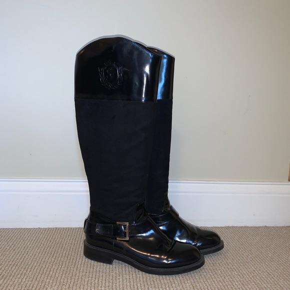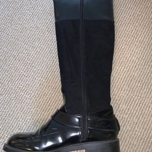 Zara patten leather/brushed suede riding boots with gold buckle. Vegan leather.