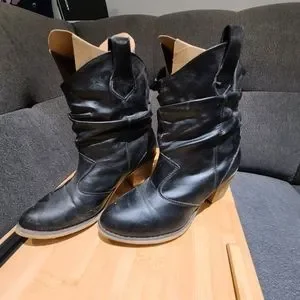 Black healed boots. size 8.5. fake leather. just over ankle height.