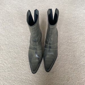 Juma grey leather 3.5” heeled boots. Excellent condition. Size Europe 38, approx 7.5 in US/Canada