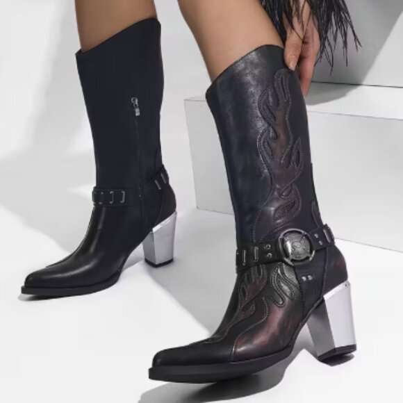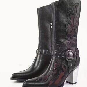 Stylish Over-The-Knee High-Heeled Knight Boots with a Chunky Heel, Featuring a Belt Buckle And an Irregular Red Distressed End