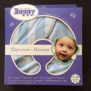 Brand new in box Boppy brand 'Signature Style' Slipcover. Colour is called Blue Team stripe (blue and white striped on one side, and solid blue on the other). The fabric is a soft minky type fabric. Fits Boppy Feeding and Infant Support pillows.