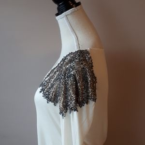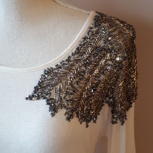 Cream modal jersey top with gold and pewter beads on the left shoulder. Super soft material. There's a tiny pin hole in the back by the neck. Can be mended. Pit to pit is approximately 17.5" and length is 27". Gently worn.