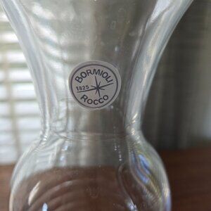 Bormioli Rocco Relief Embossed Glass Carafe, Made in Italy, marked on Front and underside, and original Bormioli Label Sticker on the side. 11 inches in height, 3.5 inches in diameter. Very Good Vintage condition, no chips, no cracks, light wear marks. Please see pictures for further details