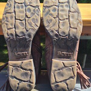 Born KENYA ankle booties. Crafted from dark brown distressed suede leather, they feature a chic tassel detail and a comfortable, everyday-ready design. Perfect for dressing up or adding a touch of flair to your casual look.