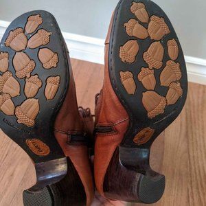 Super cute brown leather zip/lace boots. Overall good condition, one chunk missing from outside the heel, see picture. Size 6.5.