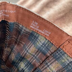 New in box. Leather is intentionally crackled and distressed. Leather edges are raw and unsealed. Light scuffs and markings. Markings mainly apparent on fabric panels on back. Few double stitches/pulled stitches.