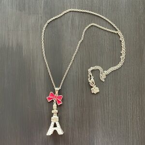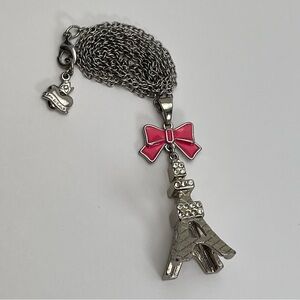 This Iron Lady Necklace has the right amount of feminine beauty. Long chain 24” with a 2.5” Eiffel Tower adjourned with a pink bow. In great condition.