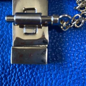 LAST 2 PICTURES- when the purse is closed with the chain detail - it appears that it sits a little crooked at the base- Inside the purse - BLEMISH- on the material in 2 spots- not visible to the outside