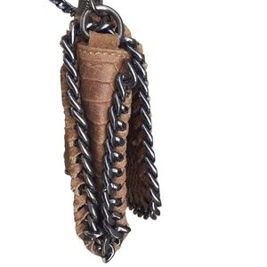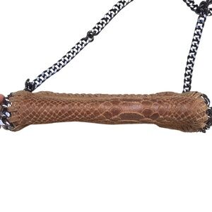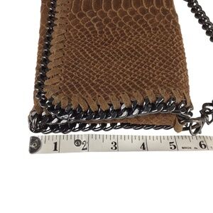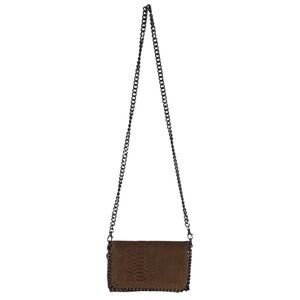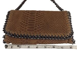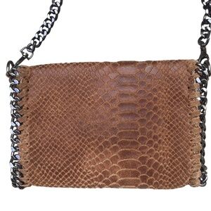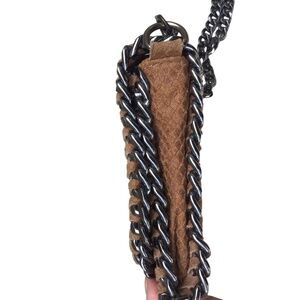 From Italian Designer Borse in Pelle, this elegant brown leather snakeskin designed crossbody bag features bold chain accents and a removable strap, easily converting to a clutch.