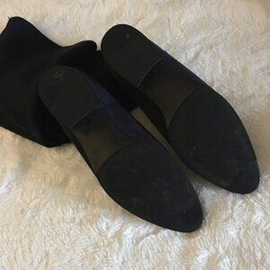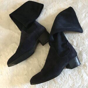 Very good preowned condition, dark navy blue tall heeled boots by Bos. & Co.. This gorgeous shoe is composed of various materials; the lower part of the shoe is authentic suede leather, while the upper is more like a velvety fabric (please note 3rd and 4th photo where fabric is draping, the other photos I added some cardboard to help them stand upright). These are so stylish and elegant. The colour is a dark, modern and blue with a black outsole for absolute chicness.