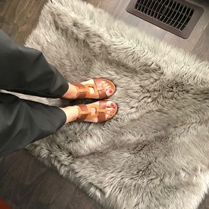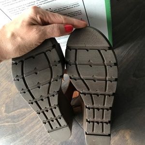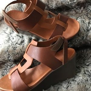 Gorgeous platform wedge sandal crafted with beautiful leather. Never been worn, I have the original box. Color-blocked straps add ample '70s attitude to this lofty wedge sandal. Style Name:Bos. & Co. Somo Platform Wedge Sandal (Women). Color: Cognac/ Camel. Sandal is very comfortable, lightweight, leather upper and leather lining. Heel height is 3” (inch) rubber sole. Closure is a Velcro ankle strap, easy on and off! Made in Portugal.