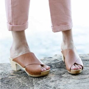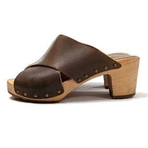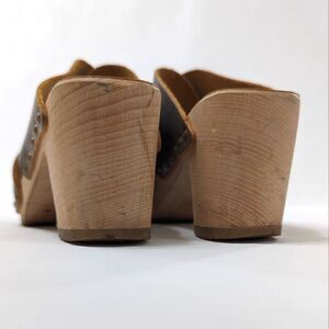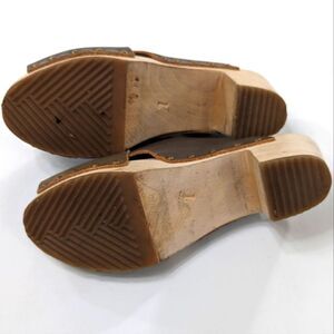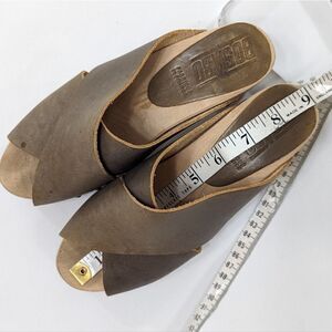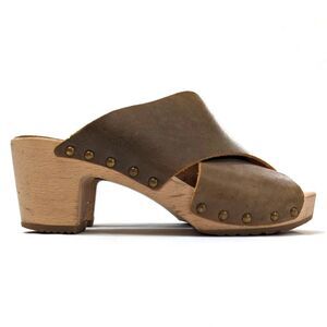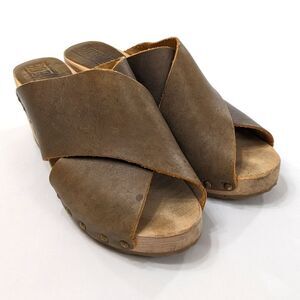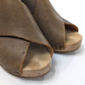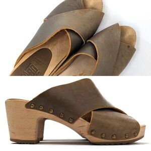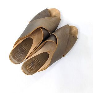 Look to be worn only once or twice. Mildly distressed muddy olive leather upper, light wooden sole.