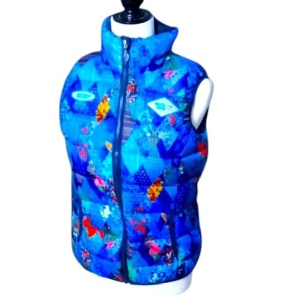 Vibrant blue puffer vest with a patchwork design. Features colorful patterns and a zip closure.