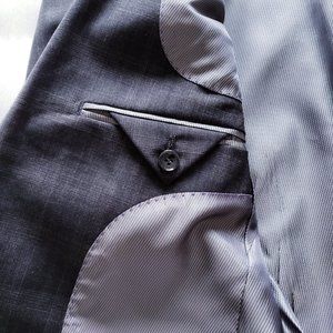 Single-breasted, Two-button, Suit Jacket. Notch lapels. Semi-canvas. Fully lined. Double vent.