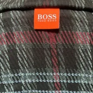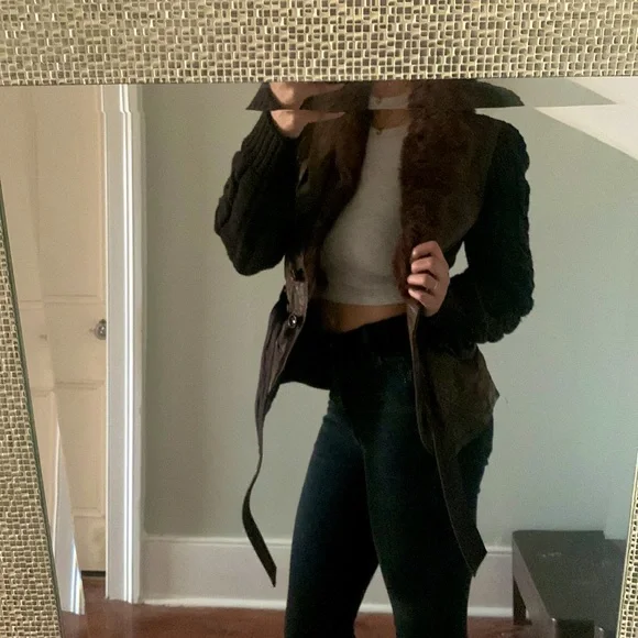 Hugo boss brown leather jacket with knitted sleeves, patterned inside and furred collar